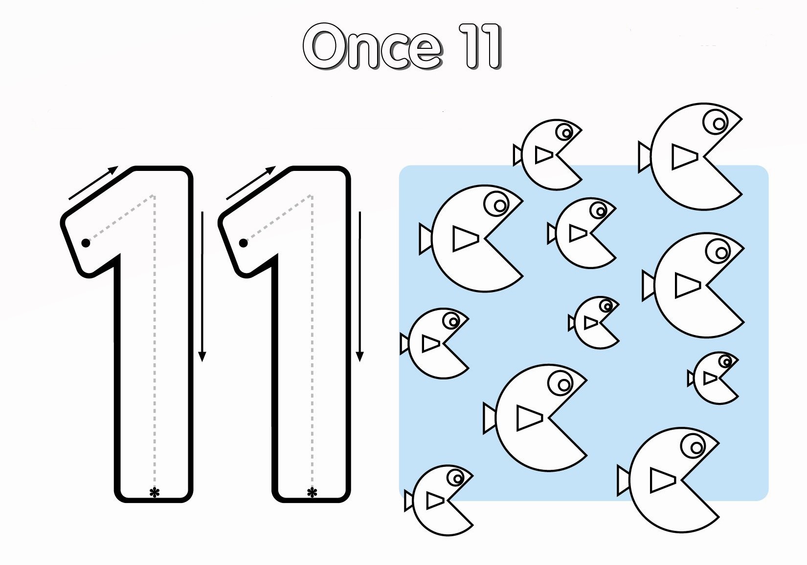 Con ayuda de tus padres imprimo la ficha. Coloreo el número once (11) de azul. Decoro el número recortando y pegando círculos. Luego coloreo los dibujos y su nombre como prefiera.