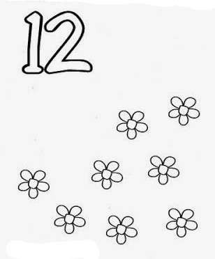 - Con la ayuda de mis padres imprimo la ficha del número doce (12). Decoro el número con bolitas de papel. Cuento las flores y dibujo las que faltan hasta completar doce (12). Luego las coloreo como prefiera.