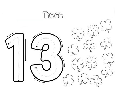 - En compañía de mis padres imprimo la ficha. Coloreo el número trece (13) de color morado. Luego decoro el número con triángulos del color que prefieras. De igual forma, coloreo los dibujos y su nombre como prefiera.