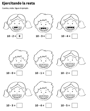En compañía de mis padres imprimo la ficha. Contamos los dientes de los niños. Coloreo de negro los dientes que ha perdido cada niño o niña y luego cuento cuantos dientes le quedaron. Miramos el ejemplo. Colocamos los números donde corresponden y coloreamos la cara de los niños.