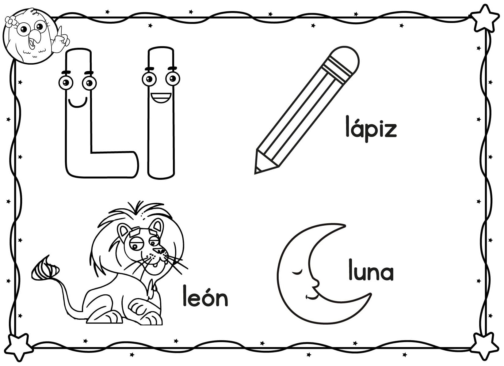 - En compañía de mis padres imprimo la ficha y decoro la letra L mayúscula con bolitas de papel anaranjado o naranjado y la l minúscula la coloreo de azul. Coloreo los dibujos como prefieras y recuerdo sus nombres.