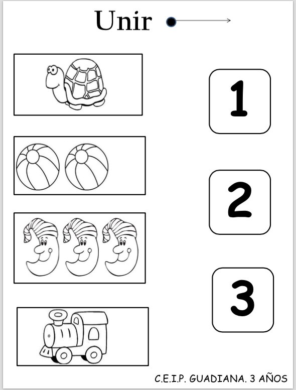 En la compañía de mis padres imprimo la ficha; con un lápiz uno los números con la cantidad de elementos. Luego coloreo los dibujos.