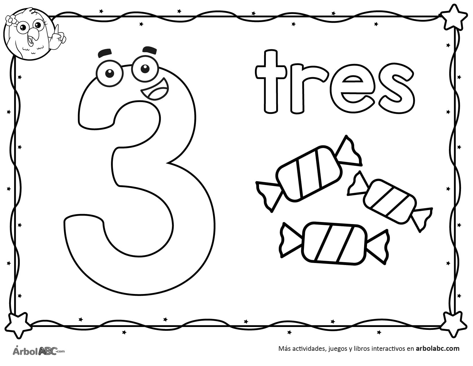 En compañía de mis padres imprimo la ficha. Decoro el número tres (3) rasgando y pegando papel de color morado. Luego coloreo los dulces como prefiera.